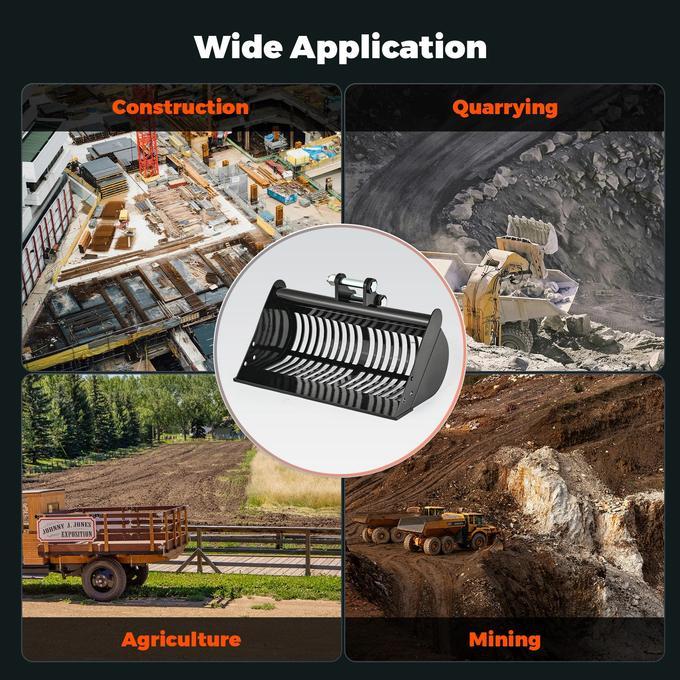 - Wide Applications: This screening skeleton bucket attachment is excellent for sorting solid materials and recovering rocks buried in sediment. It's ideal for use in agriculture, gardening, small construction, demolition, landscaping, and waste disposal