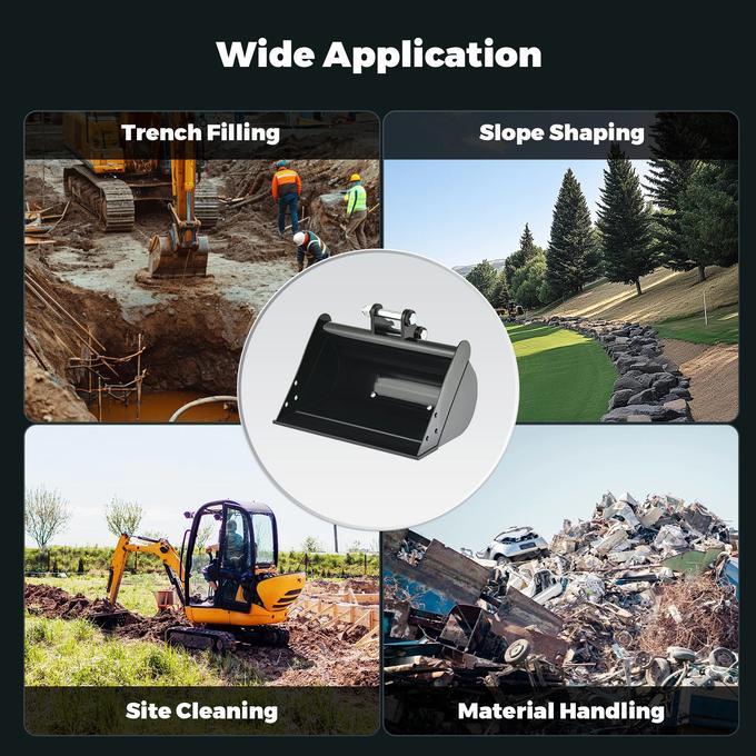 - Wide Applications: This grading bucket enhances your mini excavator's efficiency and performance. It’s perfect for tasks such as landscaping projects, construction sites, roadwork, demolition sites, agricultural fields, and more