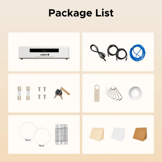 Desktop Laser Engraver x1 USB Cables x2 Power Cable x1 Hex Wrench Set x1 Fuses x2 Keys x2 USB Drive x1 Pipe Clamps x2 Exhaust Pipe x1 Wood Blanks x3 Acrylic Blanks x3 Cardboard Blanks x3 User Manual x1 |