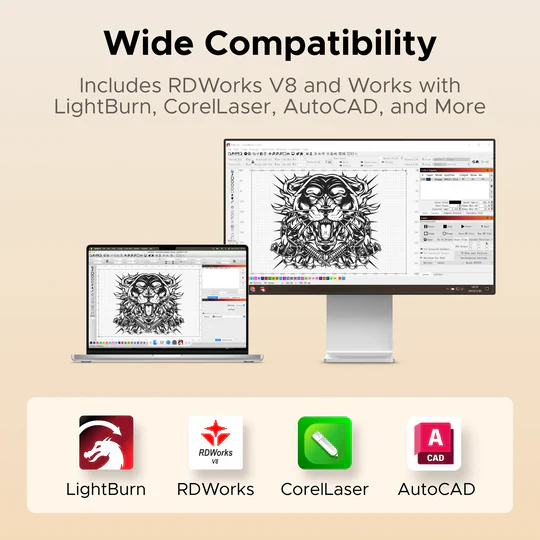 Rated Power: 55W Dimensions(L*W*H): 41.1 x 22.2 x 11 in. (1045x565x280 mm) Standard Processing Area: 20.1 x 11.8 in. (500x300 mm) Front & Rear Pass-Through: 15.8 x 0.3 in. (400x7 mm) Max. Material Thickness: 0.7 in. (17 mm) Max. Material Thickness (Without Workbed): 2 in. (51 mm) Est. Laser Service Life: 11000 hr. Max. Processing Speed: 19.6 ips (500 mm/s) Max. Resolution: 1000 dpi Mini. Letter Size: 0.04 x 0.04 in. (1x1 mm) Water Chiller Capacity: 0.5 gal. (2 L) Flow Rate: 142 gph (540 L/h) Camera Resolution: 5MP Accuracy: ±0.0008 in. (±0.02 mm) Air Assist Port Diameter: 0.3 in. (8 mm) Air Flow: 282 cfm (480 m³/h) Data Transmission: Wifi, USB Cable, Ethernet Cable Provided Operating Software: RDWorks Compatible Operating Software: LightBurn, RDWorks Certification: CE, FDA Net Weight: 90.4 lb. (41 kg) Warranty: 24 Months |